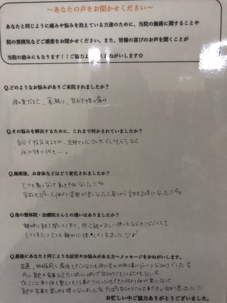 【喜びの声】伊丹市/産後骨盤矯正/体の重だるさ/肩こり/腰痛
