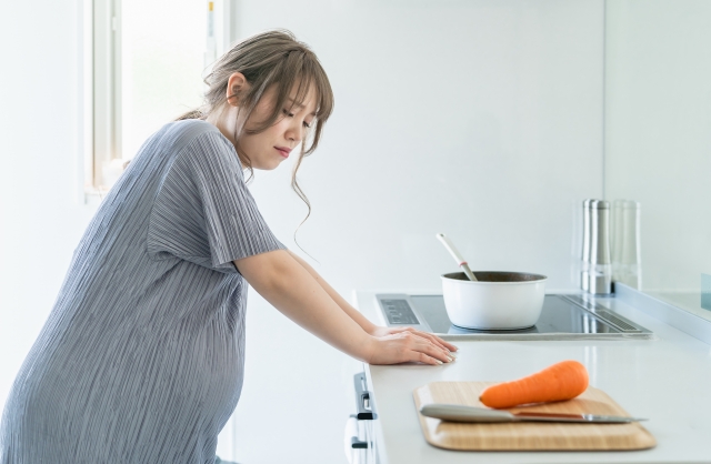 洗い物や掃除機がけなど、前かがみになる動作では、膝を軽く曲げて腰を落とすようにすると骨盤への負担が軽くなります。