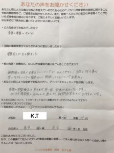 施術後の自宅で出来るトレーニングがわかりやすく、自宅で行う事も苦にならないくらい簡単なので持続してトレーニング出来る。