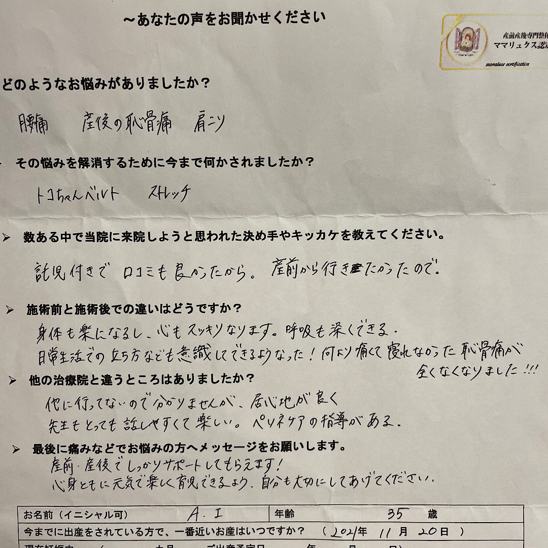 日常生活での立ち方なども意識できるようになった!何より痛くて寝れなかった恥骨痛が全くなくなりました!!!