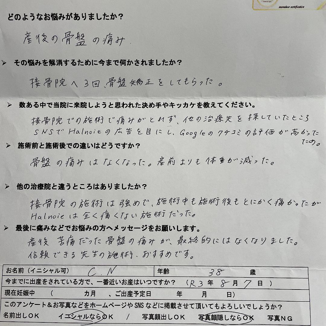 産後苦痛だった骨盤の痛みが、最終的にはなくなりました。