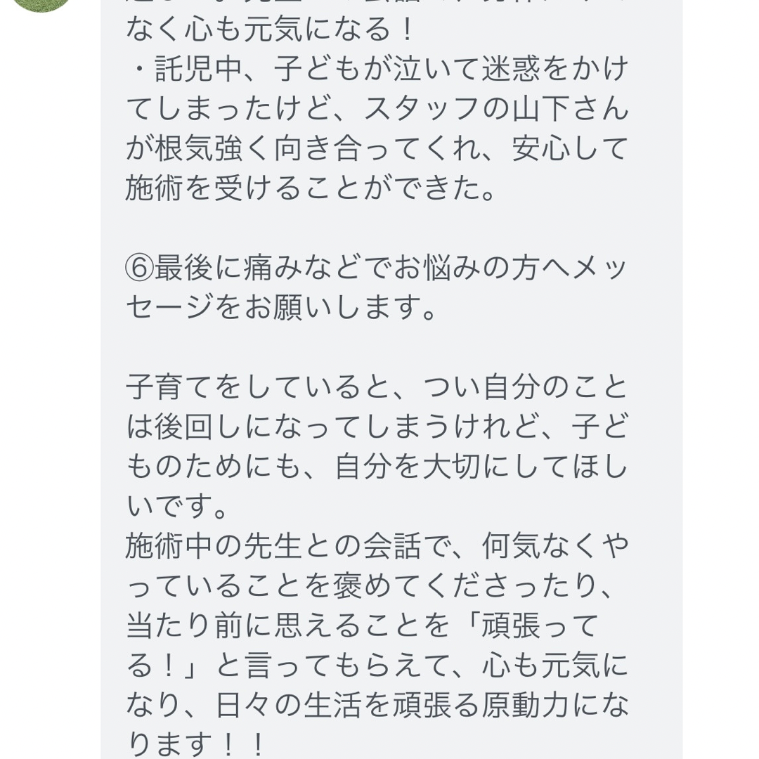 施術中の先生との会話で、何気なくやっていることを、「頑張ってる!」と言ってもらえて、心も元気になり、日々の生活を頑張る原動力になります!!