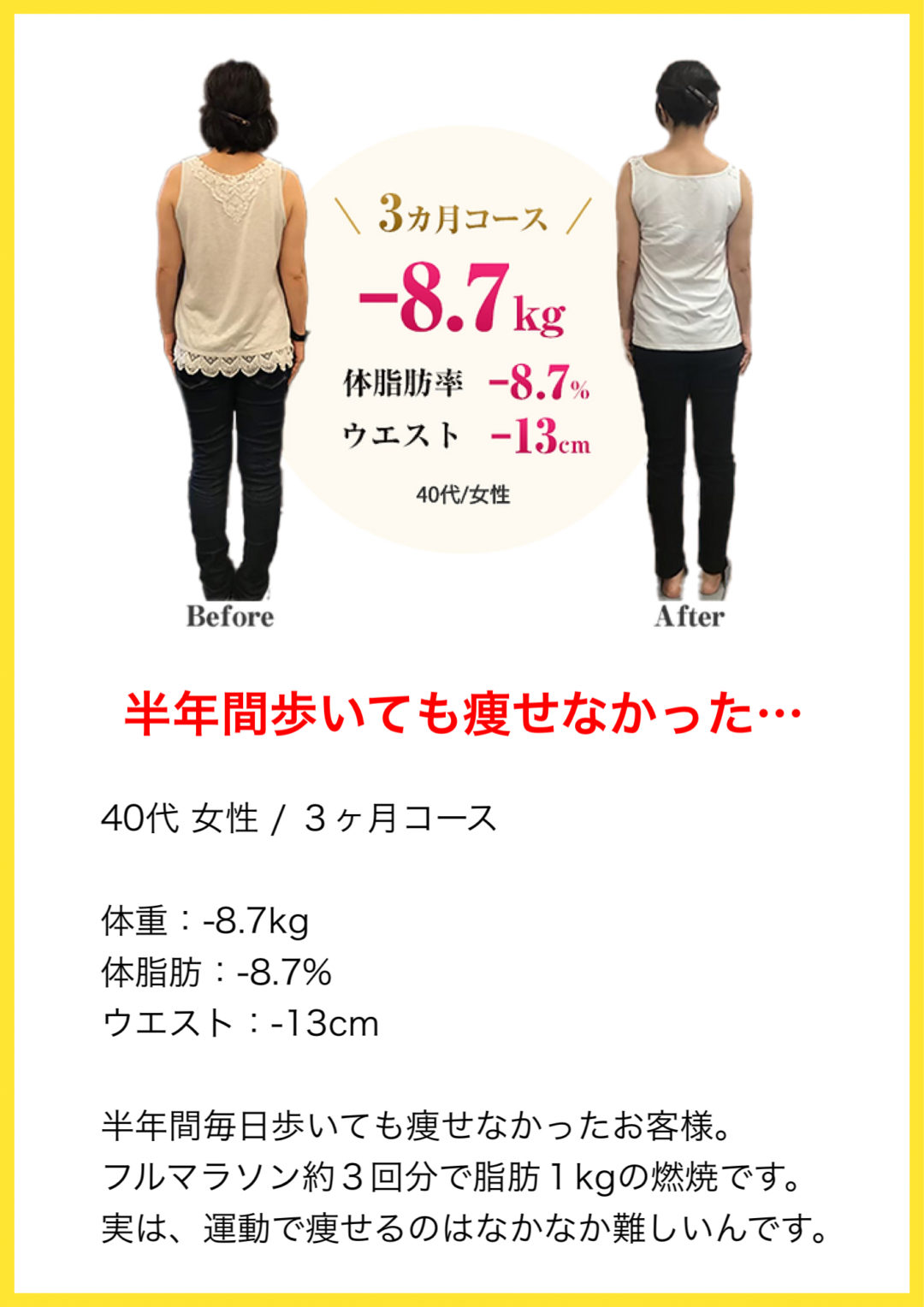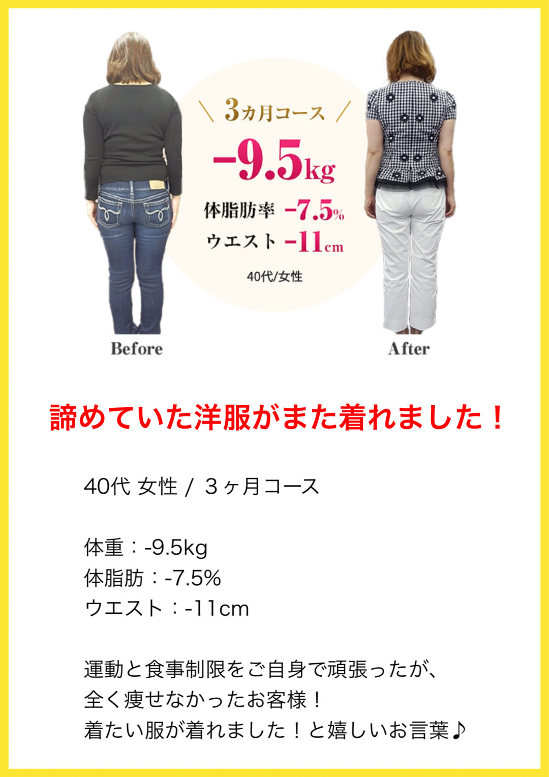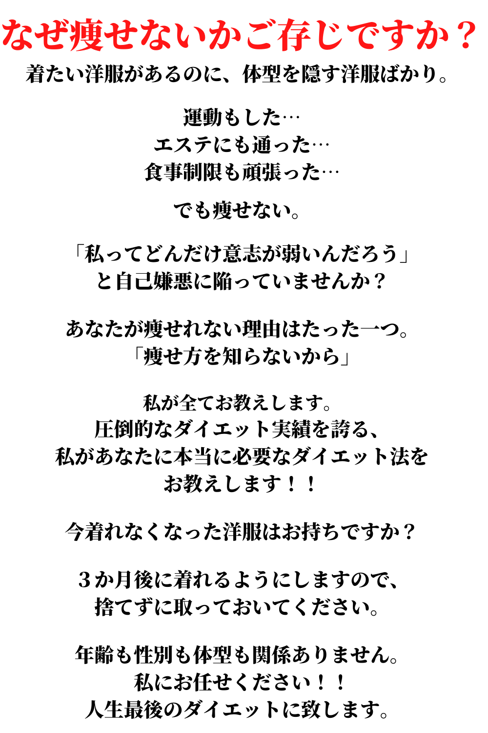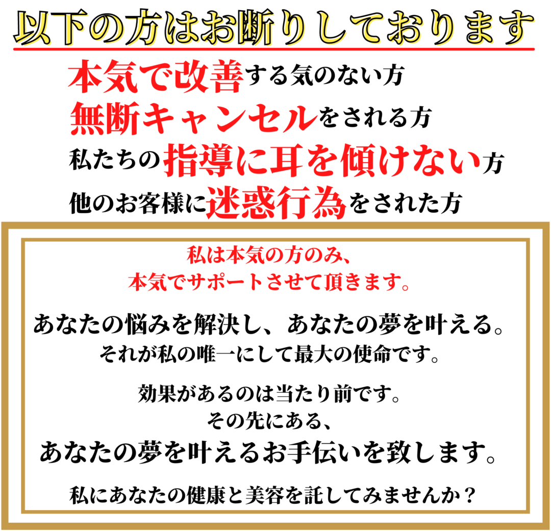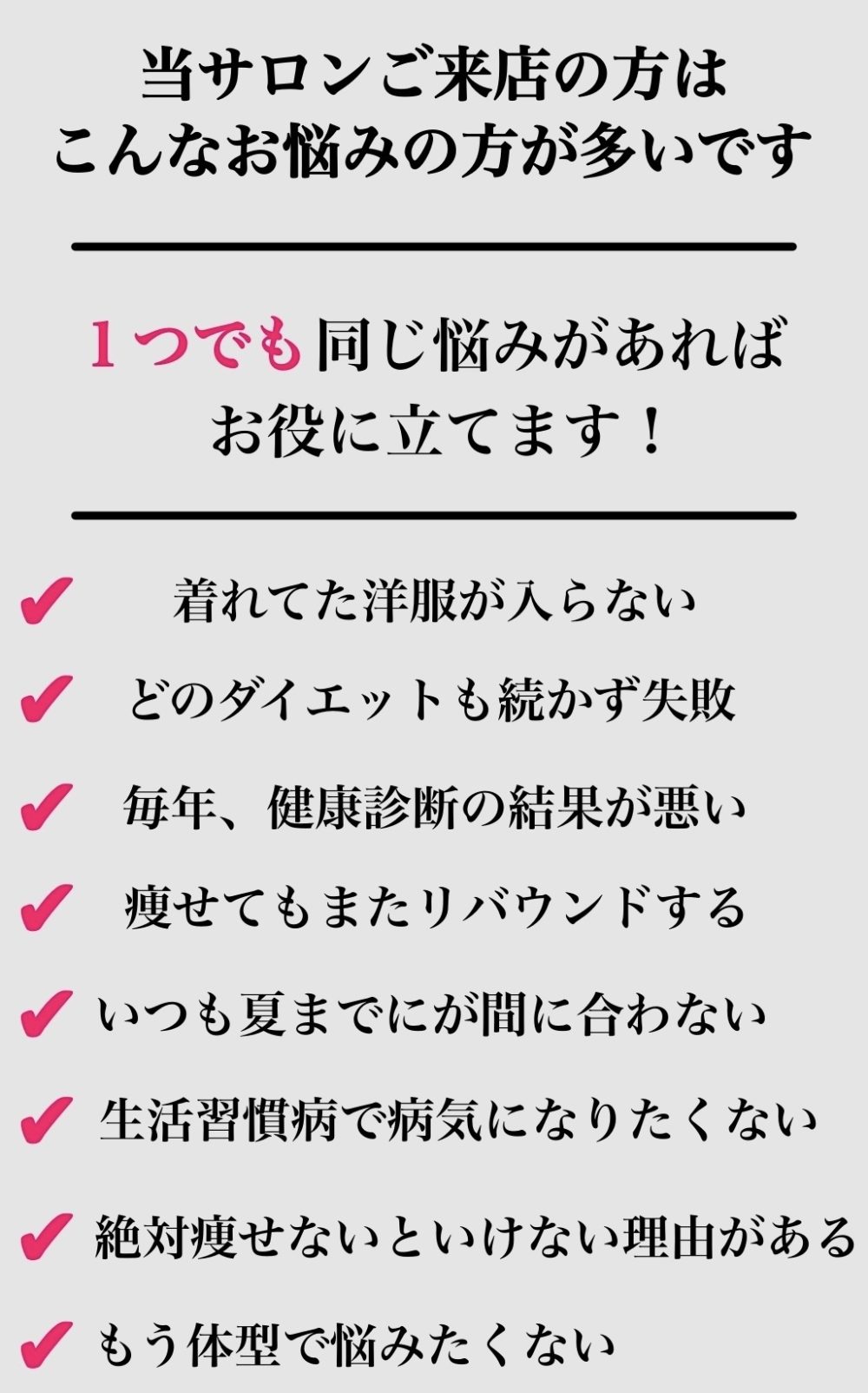 ダイエットを諦めていた方、何をやっても変われなかった方の、 最後の砦となれるよう、お一人お一人に真剣に向き合っていきます。