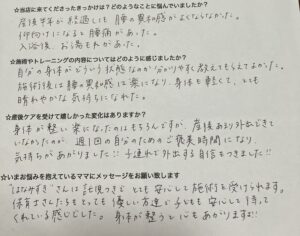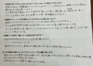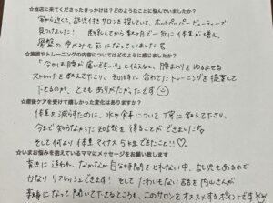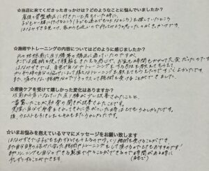 自分の体がどういう状態なのか分かりやすく教えてもらえてよかった。施術後は腰の違和感が楽になり、体も軽くてとても晴れやかな気持ちになれた